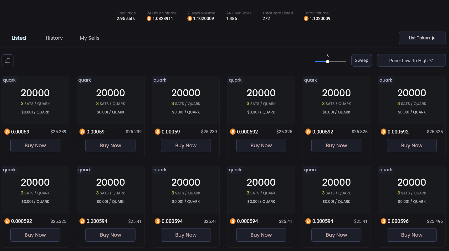 目前,夸克总供应量为 50 万张,每张 2 万枚币。据 Atomical Market 数据,截至撰稿时,一张夸克价格为 25 美元,市值超 42 万美元,24 小时交易量超 5 万美元。