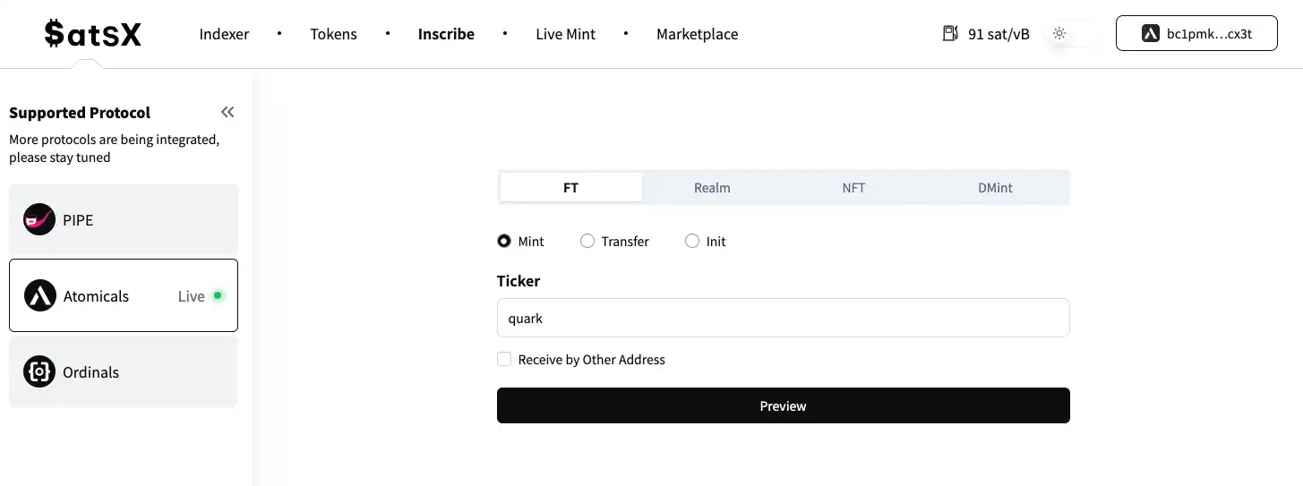 进入代打网站satsx,链接钱包后。在 Inscribe 页面中,左侧选择 Atomicals,FT 选项卡下选择 Mint,并在「Ticker」处填入「quark」。若需要由其他地址接收,则勾选「Receive by Other Address」(以其他地址接收),并填入新的地址。
