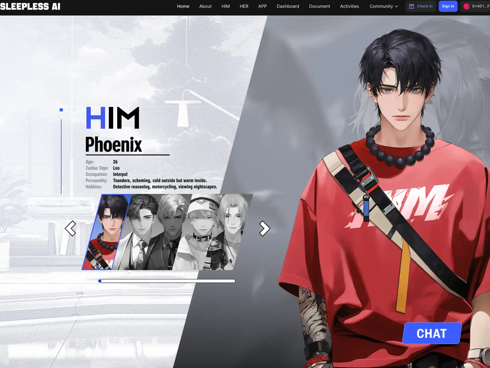 1、进入游戏官网: 使用社交登录或加密钱包访问 Sleepless AI,提供超过 10 个男朋友角色供您选择,每个角色都具有鲜明的个性,等待用户探索。一旦做出类型选择,他将成为你的 SBT(灵魂绑定代币),专属于你,无法交易。