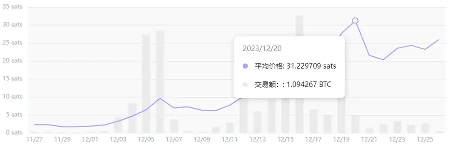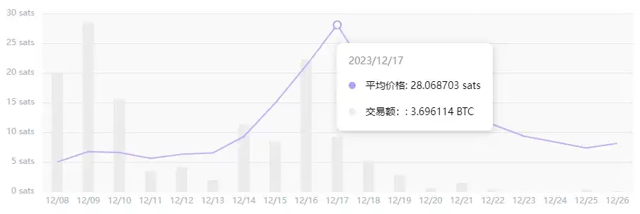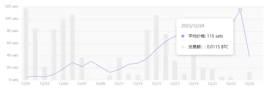 关于发售,其 CHAX 的单价为 0.00045 美元,每张票的价格为 50 美元。其最高价格达到 115 Sats,目前为 29.8 Sats,当前市值约为 2720 万美元。