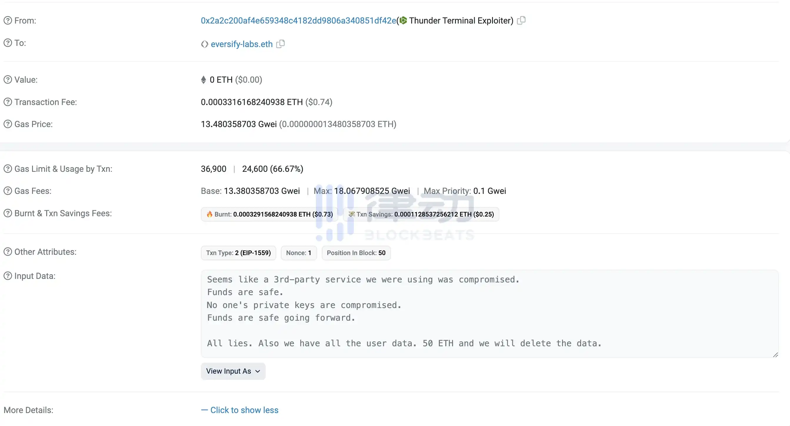 Thunder 攻击者索要 50 ETH 以删除掌握的用户数据