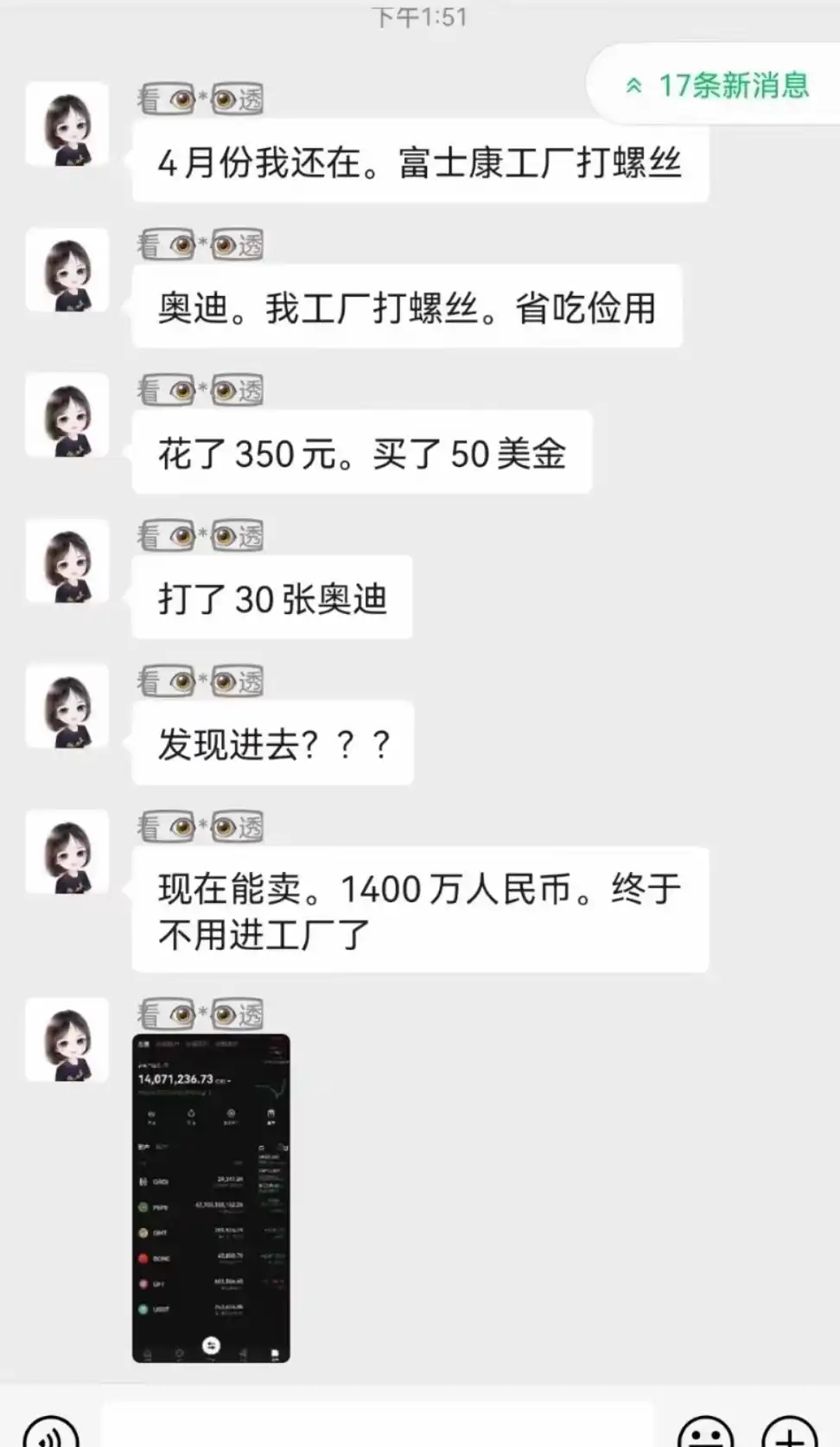 而其中就有一位幸运儿,「富士康打螺丝」省吃俭用,花 350 元打了 30 张 ORDI(也即 3 万枚 ORDI),最终成功变为 1400 万元。