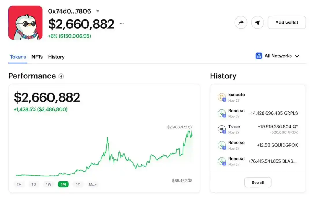 首先是 12 月 19 日,一位交易者通过交易 COQ,在两周内将 454 美元变成了 219 万美元,收益达 4827 倍: