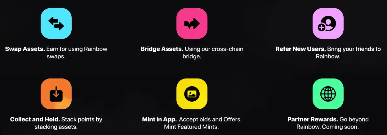 Rainbow 正在推出积分计划,用户将有以太坊、Arbitrum、Polygon、Optimism、Zora、Base、BSC 上的有过交易活动的钱包地址导入 Rainbow,即可奖励「追溯积分」(快照时间截止到 2023 年 12 月 11 日 17:00 UTC)。钱包中的余额、交易次数、跨链次数都会积累有效积分,在快照时间前持有 Rainbow NFT 也会获得积分。