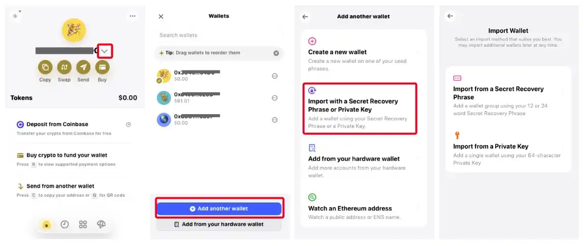 如果要添加新的钱包,点击当前钱包地址,弹出钱包列表,点击「Add another wallet」添加新的钱包。在弹出的界面中通过助记词或私钥地址导入钱包。