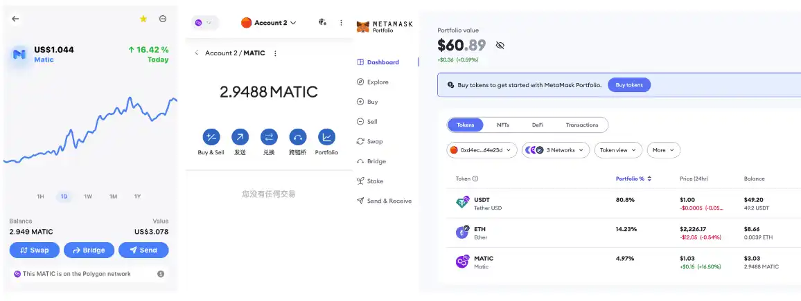 而 MetaMask 在这一界面仅提供了代币交易功能,用户需要点击「Portfolio」,才能跳转到网页端查看涨幅等更多信息。