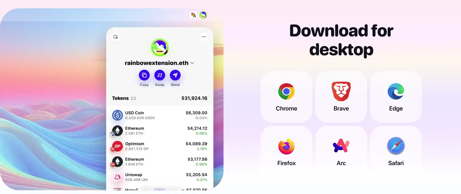 Rainbow 诞生于 2019 年,是一款以太坊开源自我托管钱包,可帮助用户管理资产。目前支持以太坊主网、Polygon、Arbitrum、Optimism、币安智能链、Base 和 Zora 网络。