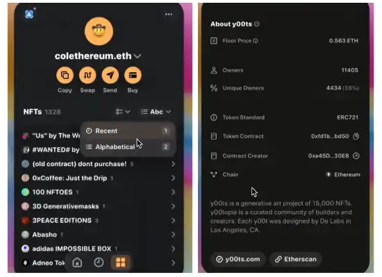 用户在 Rainbow 中的 NFT 收藏可进行个性化显示,可在以字母/时间顺序列表、画廊等显示模式之间切换,此外,用户还可以查看 NFT 的详细数据,包括地板价、持有人数及唯一持有者的占比情况等。