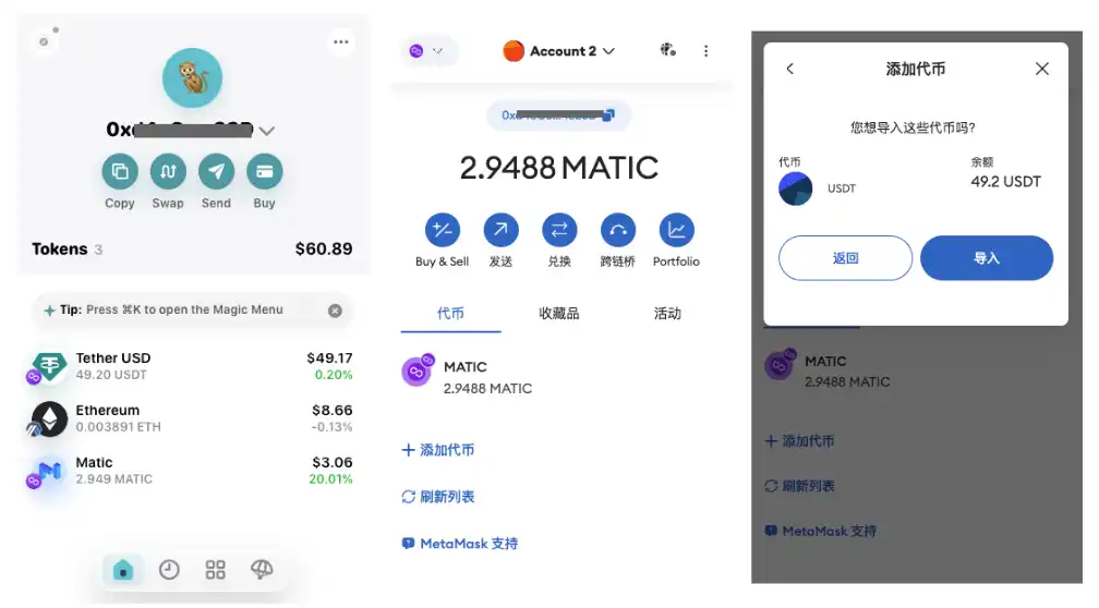 从 UI 设计来看,Rainbow 插件的 UI 设计要比 MetaMask 的更为美观一些。此外,Rainbow 可以自动检测钱包内跨网络的代币。而在 MetaMask 中,用户需要手动切换网络才能查看对应链中的资产,MetaMask 还存在币种显示不全的情况,笔者在这里手动添加了 USDT。