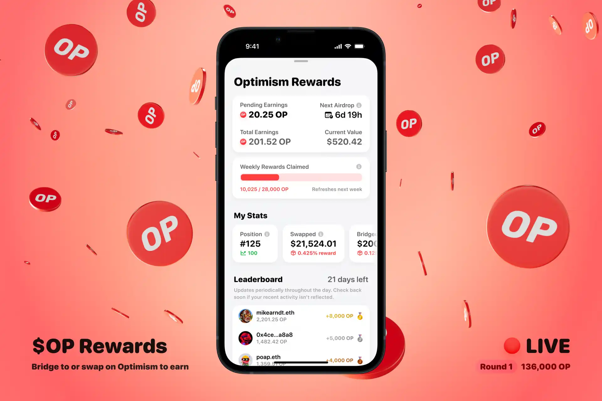 除了正在进行的积分计划。Rainbow 还与 Optimism 合作,进行了两轮奖励计划(结束时间为今日)共向用户发放了 420,069 个 OP 代币,在 Rainbow 中将代币桥接到 Optimism 或在 Optimism 上交易代币都会获得奖励,用户可期待下一次的奖励活动。