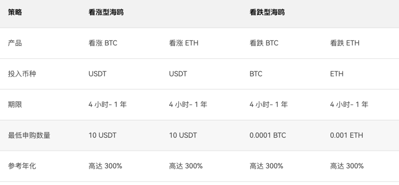 海鸥是 OKX 12 月上线的最新结构化理财产品,目前使用海鸥赚取收益的用户超 1500 人。是 OKX 结构化理财矩阵中的一员,本质仍然是简单期权,主要分为看涨海鸥和看跌海鸥两个方向,看涨海鸥支持用户投入 USDT,看跌海鸥支持用户投入 BTC 和 ETH。仅上线不到一个月,用户申购金额已达 356 million。