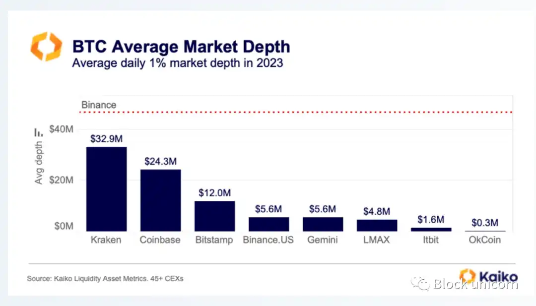 在 2023 年,Kraken 的比特币订单簿平均深度最大,为 3290 万美元,Coinbase 紧随其后,为 2430 万美元。为了提供背景,Binance 的平均每日市场深度用红色表示。