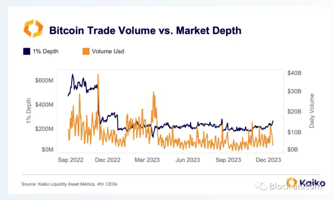 总结一下,比特币市场深度在大部分时间里保持平稳(流动性没有变化),而点差大多数时候有所收窄(交易者成本较低),但 ETF 的批准可能会改变这一状况。