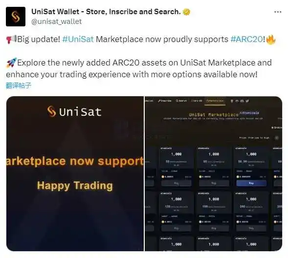 UniSat Wallet:交易市场已支持 ARC20 资产