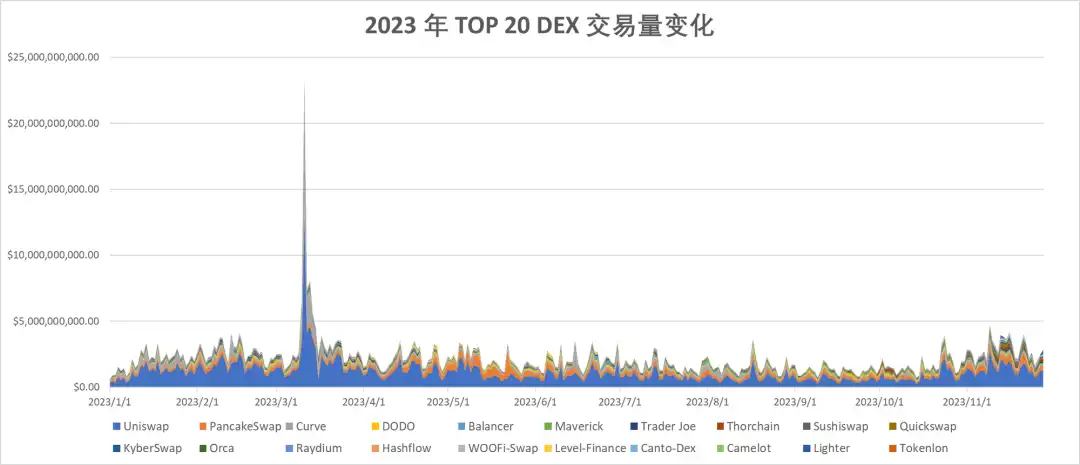 「2023 年 DEX 总交易量在年初和年末处于高位,其余时间在低位保持震荡,与大盘走势呈现一定的正相关关系。」