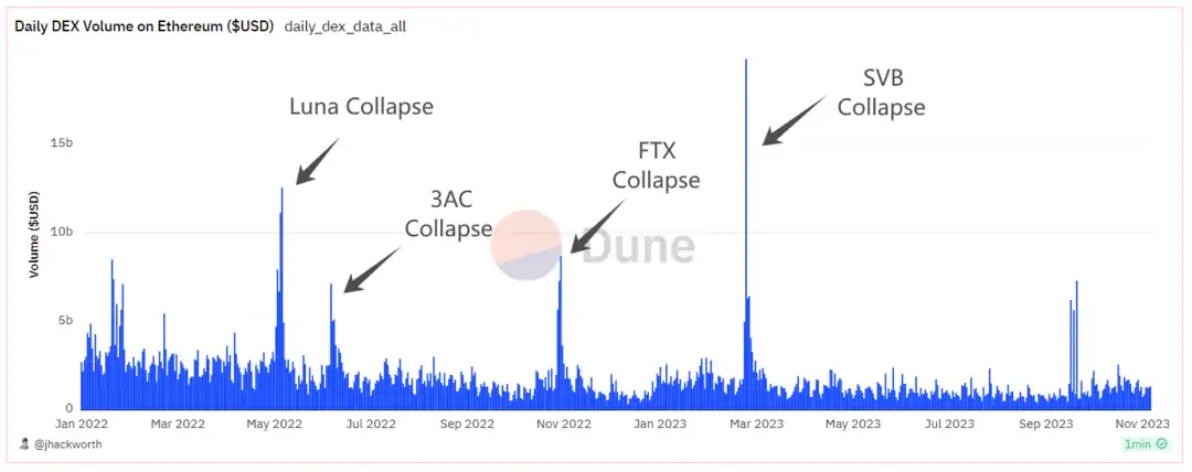 与 CEX 最本质的区别是,DEX 重复做编程规定的事:提供无许可交易。在中心化实体(如 FTX,BlockFi,Celsius 和 Voyager)崩溃的日子里,DEX 的交易量大幅飙升,创下巨量的单日交易日。SVB 崩溃(和 USDC 脱钩)导致 DEX 交易量的最大单日交易量为 ~19.7B 美元。