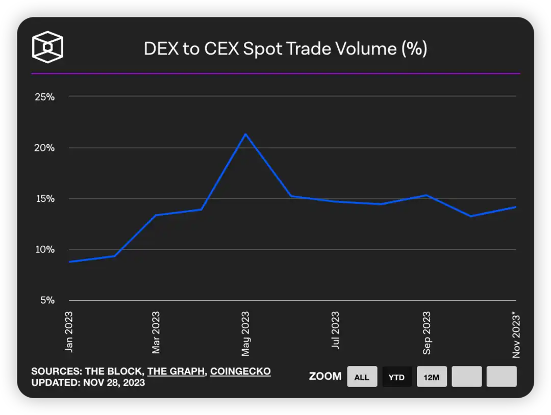 后回落稳定在 15% 附近。这延续了上一年的趋势,FTX 暴雷引发的信任危机迫使用户资产向 DEX 转移。同时 DEX 的用户体验也在进一步优化,如 Uniswap、Paraswap 等陆续推出自己的钱包 app。