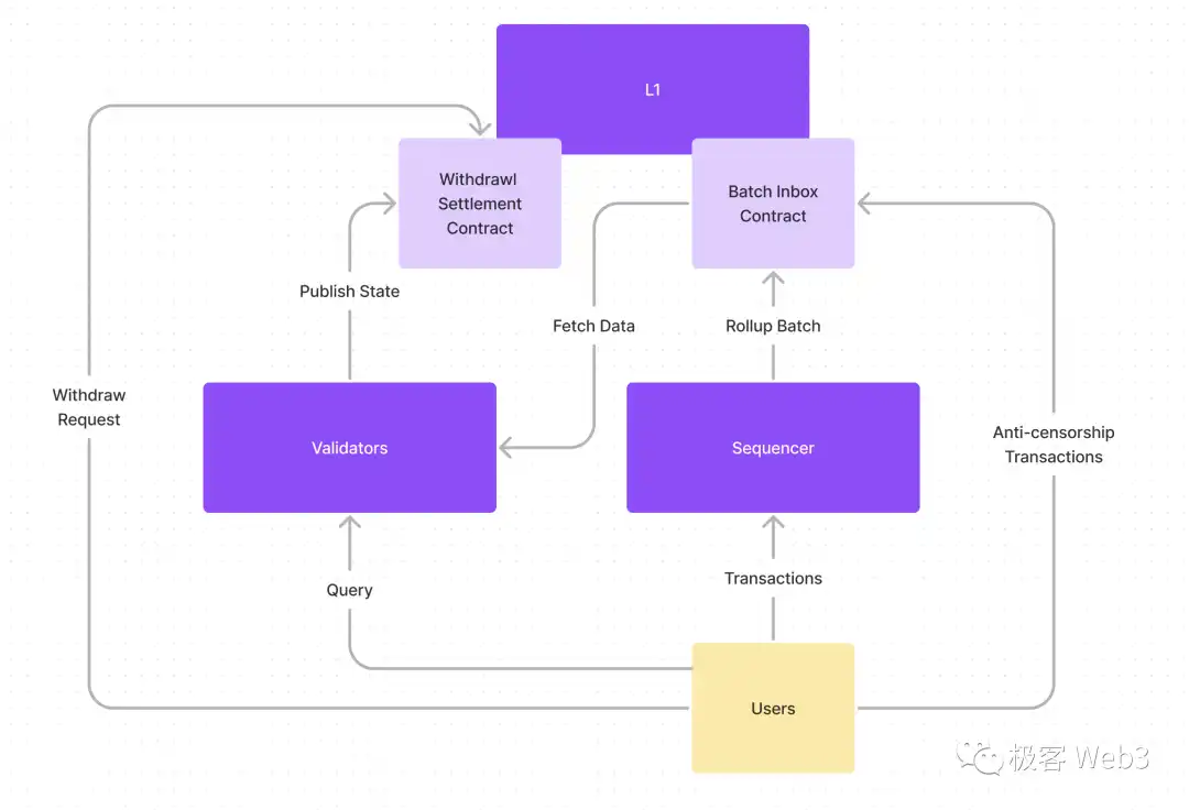 ·执行层:一台服务器,用于接收用户交易并执行,同时将用户签名后的交易数据批量提交到 DA 层,与 Rollup 的排序器相似。但执行层并不一定要有区块链式的链表结构,它可以完全是 Web2 数据库+计算系统,但整个计算系统必须开源,具备透明度。