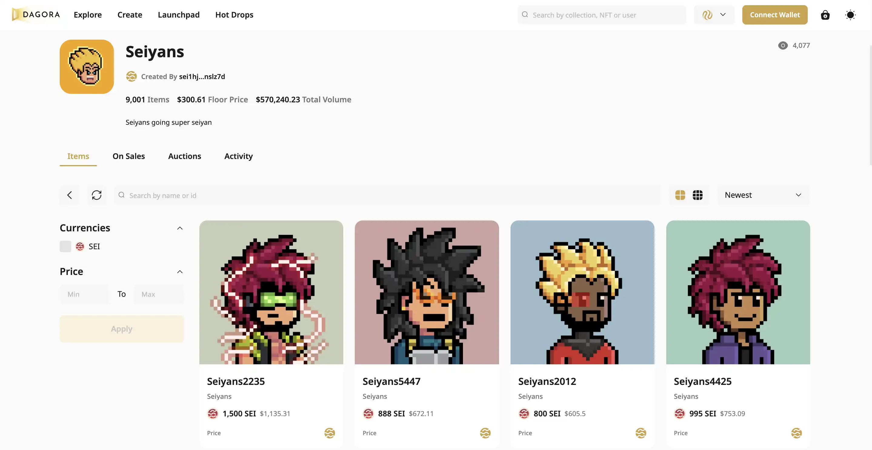 Seiyans 是 Sei 上一套赛亚人相关的 NFT 合集,于 12 月 28 日公开 mint,据 Dagora 数据,截至撰稿时,Seiyans 地板价为 300 美元。