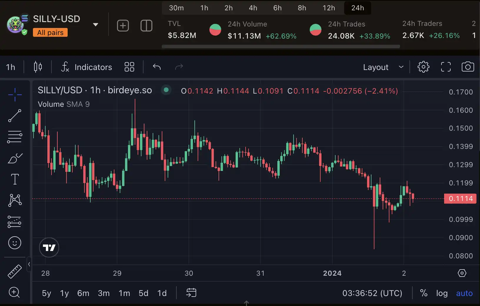 12 月 8 日,负责 Solana 增长的 Yaoyao(@ynonestop)将「silly」和「Solana」两个单词合为「Soylano」,发文表示「2024 年是中国的龙年,这将是傻龙(Soylano)的加密年。」据 Birdeye 数据显示,截至发稿前,SILLY 价格为 0.11 美元,24 小时跌幅达 13.94%。