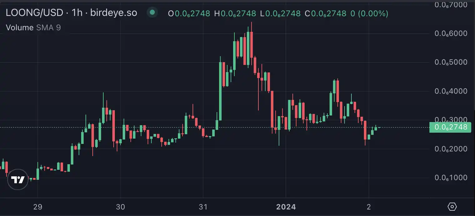 据 Birdeye 数据显示,截至发稿前,LOONG 价格为 0.000000027 美元,24 小时跌幅达 12.39%。
