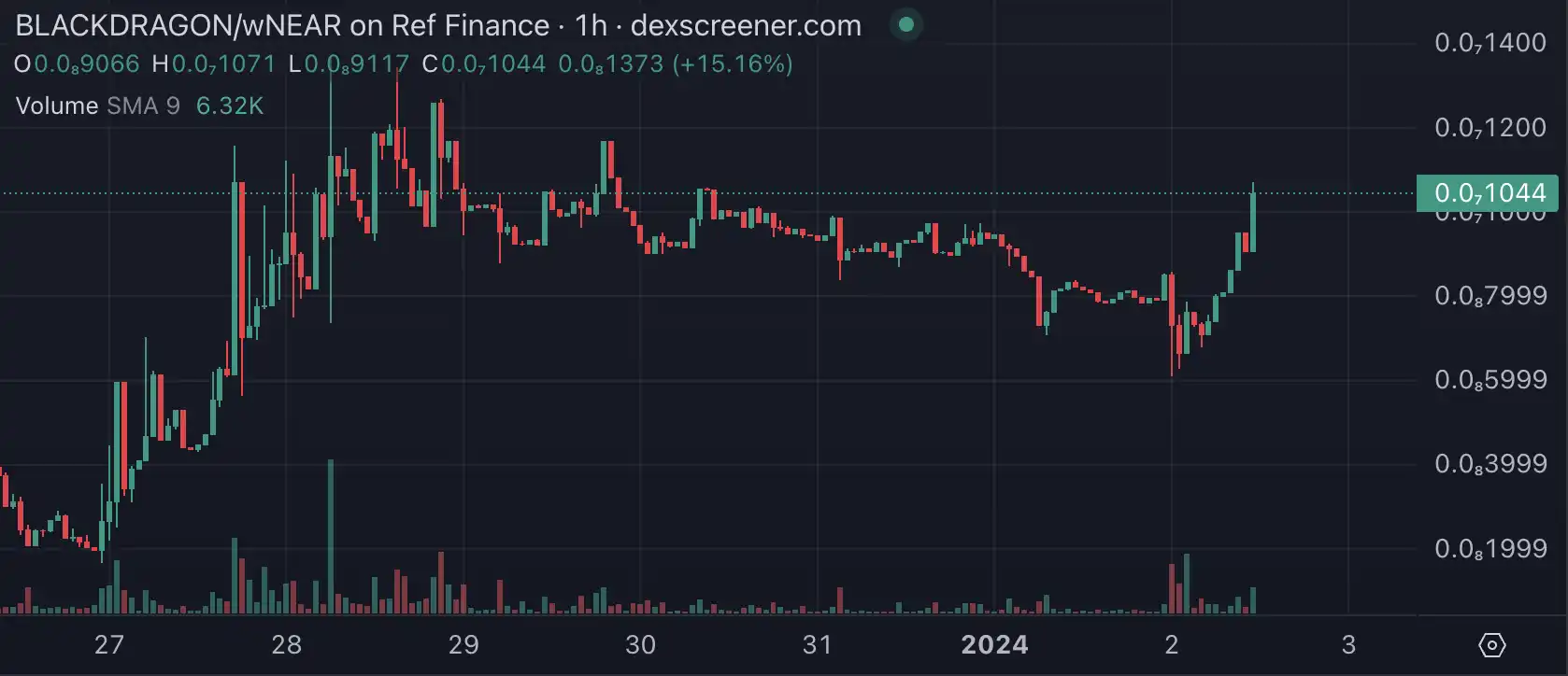 Black Dragon 是 Near 上的龙概念 meme 币,其由 Near 社区建立,一开始通过 ShardDog 平台空投给生态参与者。据 DEX Screener 数据显示,Black Dragon 市值为 100 万美元,截至撰稿时,BLACKDRAGON 价格为 0.00000001 美元,24 小时涨幅达 26.65%。
