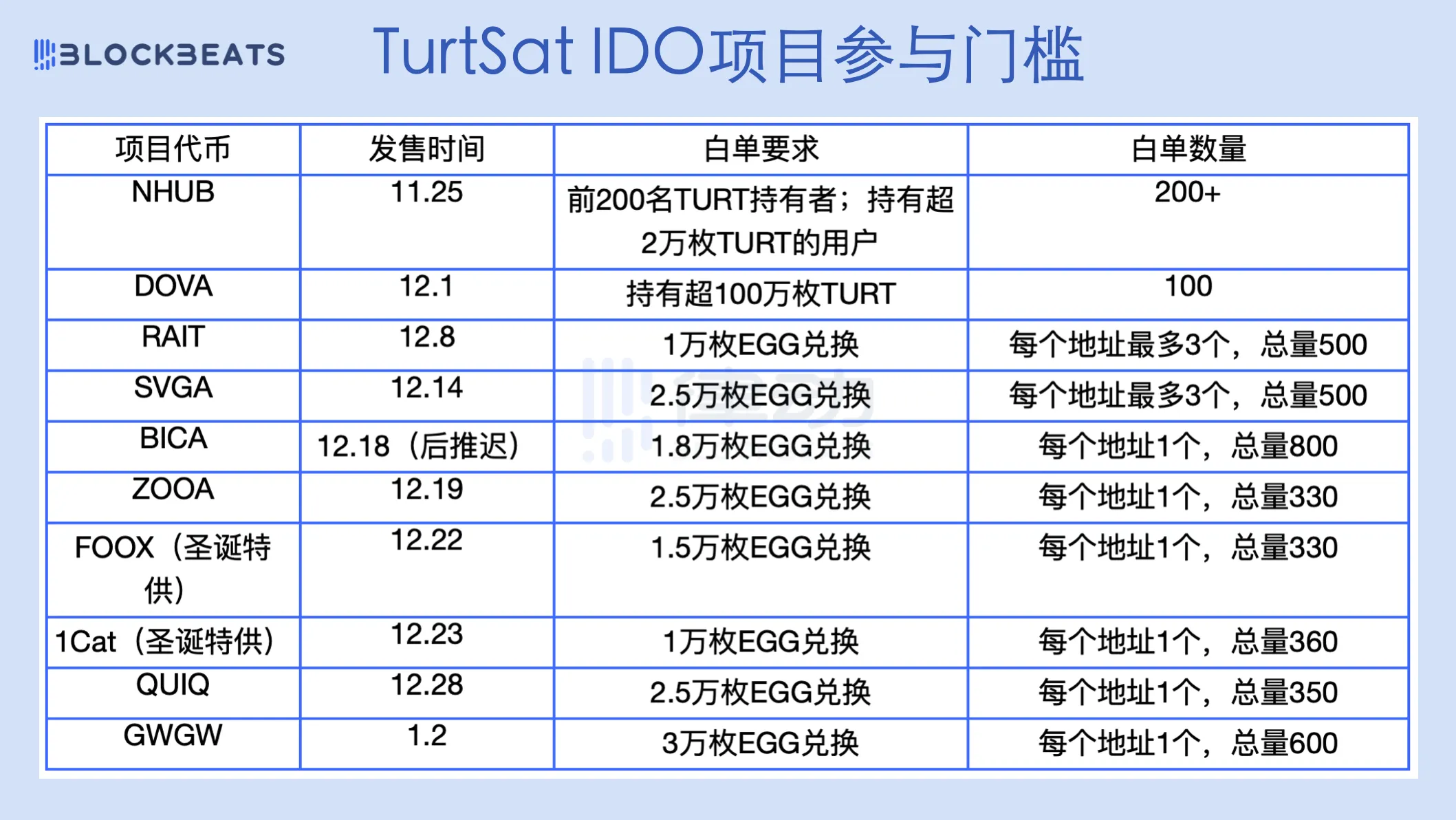 与 Bounce 不同,TurtSat 以白名单的方式发售项目,白名单对象包括对社区有贡献的成员和一定数量 TURT 的持有者。12 月 7 日,TurtSat 推出了新的质押机制,质押 TURT 得到 EGG,新项目的白名单中将有一部分名额可用 EGG 兑换。