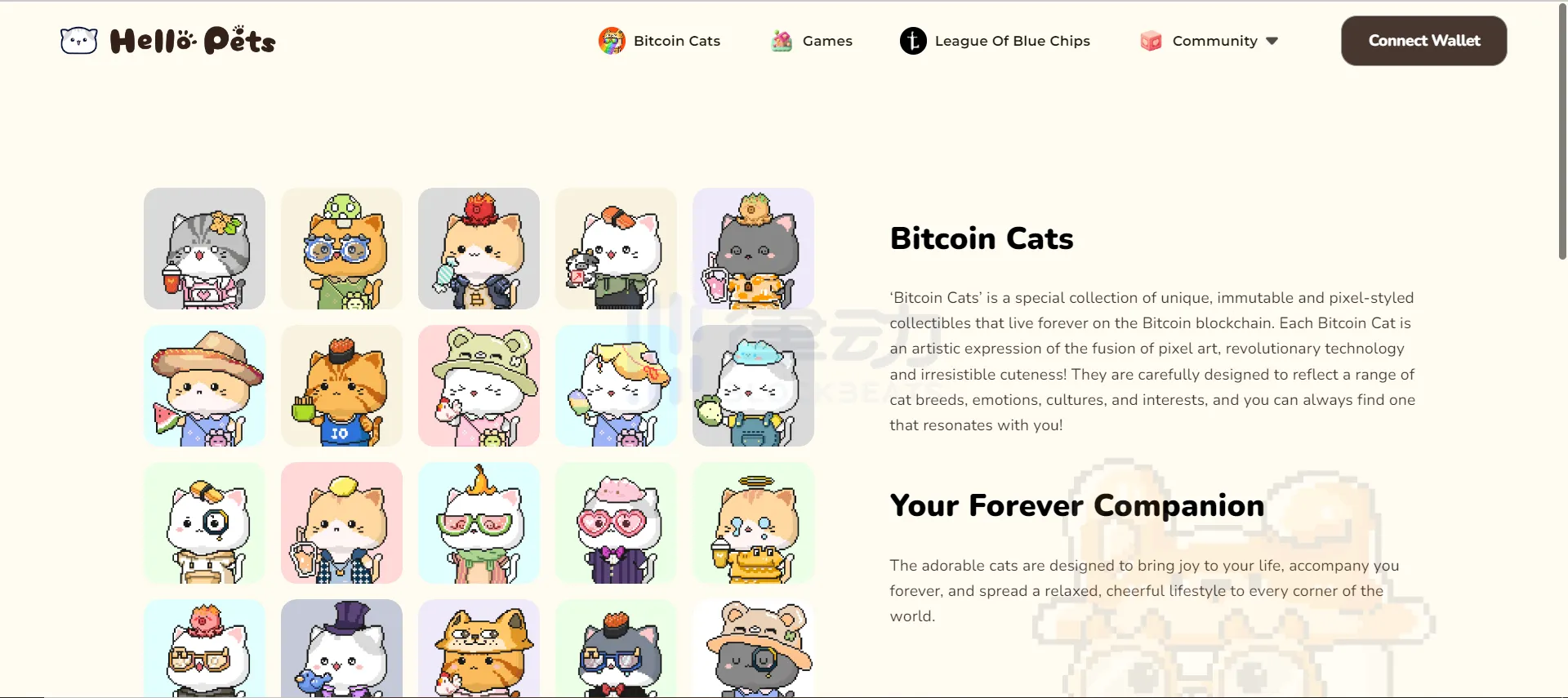 目前,BitcoinCats 并没有回应与 Hello Pets 的关系,但在 Hello Pets 官网列出了名为「Bitcoin Cats」的 NFT 系列介绍,并提供了 BitcoinCats 的主页导航。而据 了解,Hello Pets 的前身是 Battle Pets,是一款类似于 Axie Infinity、模仿 CryptoKitties 的战斗类宠物养成游戏。Battle Pets 在今年 1 月改名为 Hello Pets,并将定位转换为「数字世界和现实世界中全球知名的可爱品牌。」