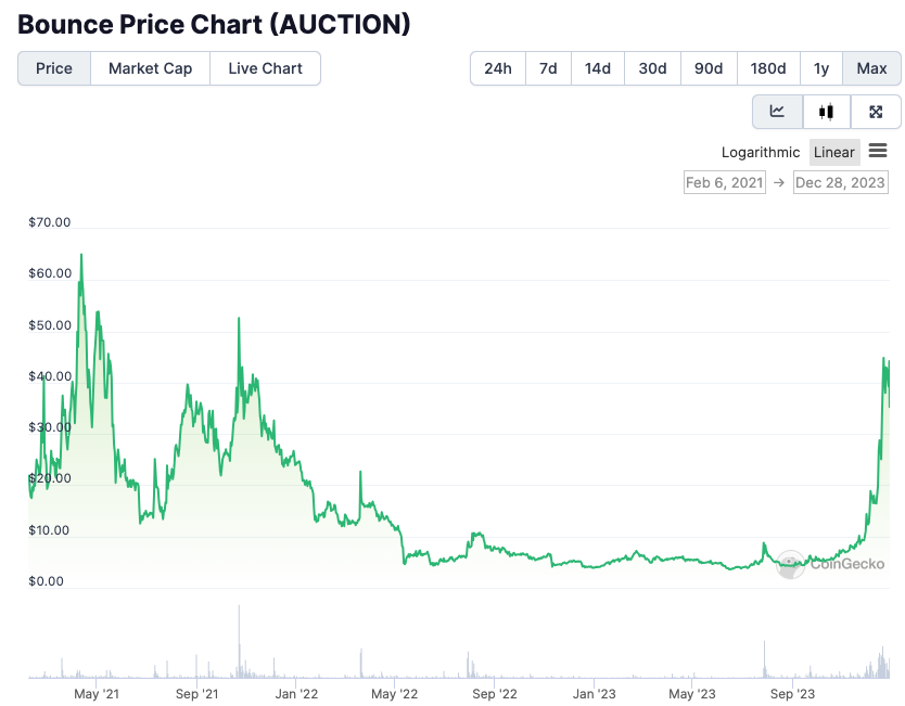 最先开始的是 Bounce Brand,一个成立于 2020 年的以太坊上去中心化拍卖平台。2021 年,引入了初始 IDO 功能的 Bounce V2 上线,乘着热潮,其代币 AUCTION 一度 60 美元。而在 2023 年的很长一段时间里,AUCTION 一直在 10 美元以下,Bounce 的 TVL 也一直在 200 万美元上下徘徊。