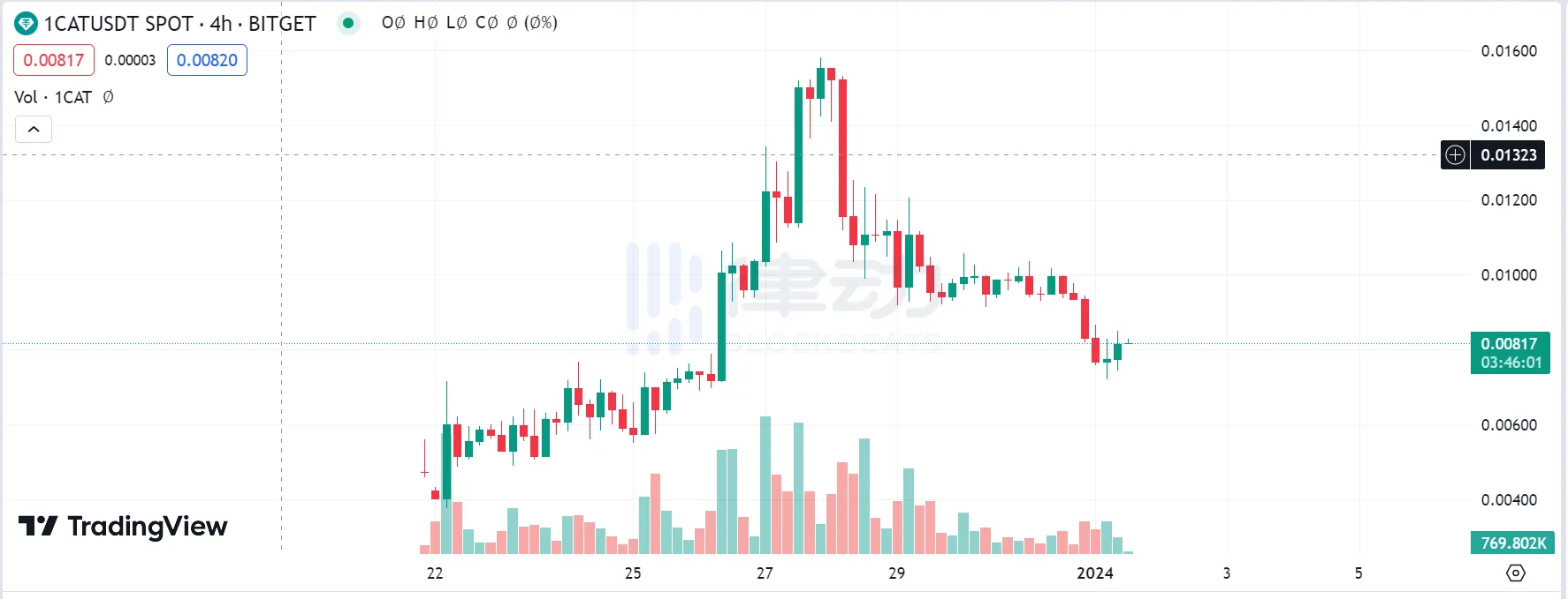 项目发展势头不足的问题不只发生在 TurtSat 上。另一边,虽然 1Cat 在开盘后表现强势,但后续发展却有些乏力。在推出之后的三日里,1Cat 仅有不到 20% 左右的涨幅,12 月 25 日,随着「1CAT 金铲计划」计划的公布,1Cat 作为铲子代币参与了 BakerySwap 之后两期的项目 IDO,其价格才得以攀升,2 日间涨幅超 150%,而这恐怕就是它的巅峰了。