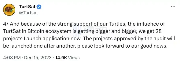 推出 Svarga 后,TurtSat 在社交平台表示,已接收 28 个项目的 IDO 申请,这些项目将陆续在平台上发售。彼时,TurtSat 上所 IDO 的比特币生态项目数量比 Bounce Brand 和 BakerySwap 上的项目数量加起来还多。但这些项目的后续发展并不如意,在 SAGA 之后的项目代币,12 月 19 日发售的 ZOOA 没能有翻倍的涨幅。28 日发售的 QUIQ 则走出了「初始即巅峰」的路线,据 OKX 数据,其发售当日的交易额为 2.9 BTC,三天之后,QUIQ 只吸引了 0.03 BTC 的交易额。