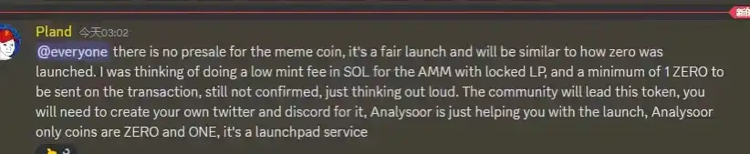 而到了 12 月 20 日,Pland 在 Analysoor 的 Discord 社区中宣布,Analysoor 将推出社区主导的 meme 币,而 Analysoor 只负责启动代币铸造并锁定流动性池。社区所推出的 meme 币中,总供应量的 48.5% 通过 0.05 SOL 和 1 ZERO 铸造,剩余资金还是作为 ZERO 的流动性池储存掐里。且 meme 币的 3% 将空投给 ONE 的持有者。