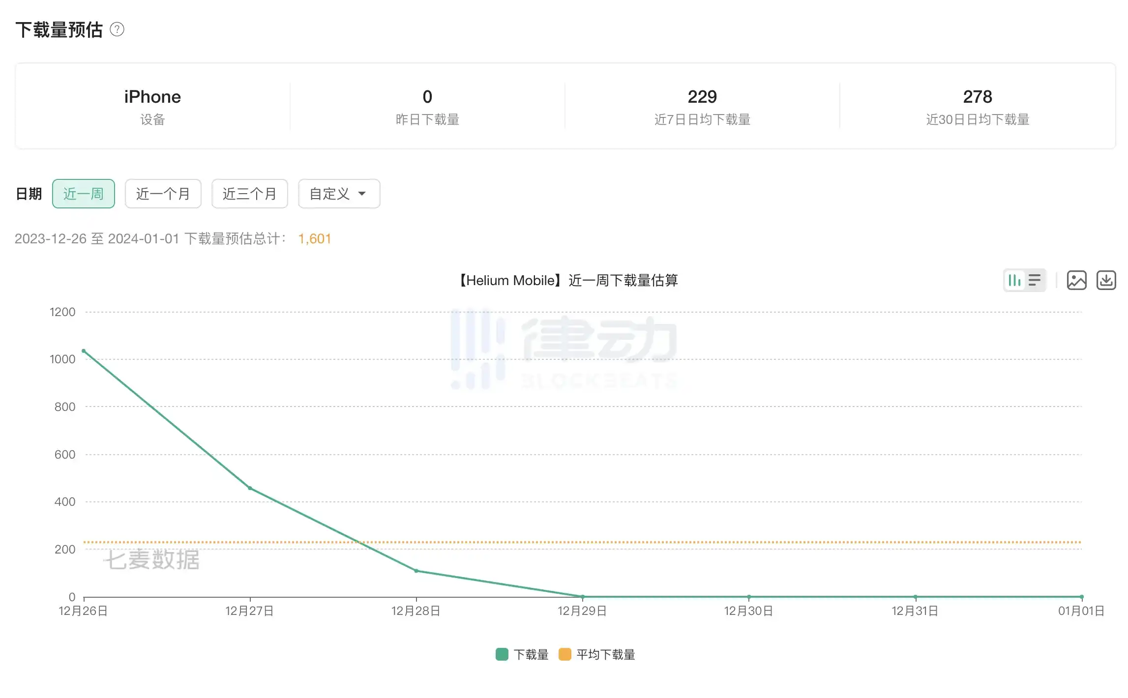 据第三方 appstore 数据平台显示,Helium Mobile 在美区 App Store 的 iPhone 用户预估下载量已连续 4 日录得 0 次,相较于前几日高点已快速大幅回落;近 7 日日均下载量在 12 月 26 日数据(1035 次)的支撑下仅为 229 次,预计该数据明日(去除 12 月 26 日数据后)将再次大幅下跌;过去一周预估下载量总计 1601 次,预计该数据明日同样将大幅下跌。