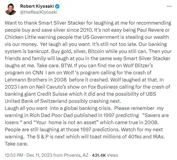 译文:想要感谢 Smart Silver Stacker,因为从 2010 年开始,他一直嘲笑我倡导人们购买并储存银子的建议。像 Paul Revere 或者 Chicken Little 一样,警告人们美国政府正在通过我们的货币窃取我们的财富,这并不容易。但无论你想笑多久都可以。现在依然不算太晚,我们的银行体系已经破产。趁你还有机会,赶紧买入黄金、银子、比特币。到时候你的朋友和家人会像 Smart Silver Stacker 那样嘲笑你和我一样。顺便说一句,我曾在 Wolf 的节目中预测了 2008 年雷曼兄弟公司的崩溃,你能在 CNN 的 Wolf Blitzer 节目中找到我。Wolf 当时也笑了。在 2023 年,我出现在 Fox Business 的 Neil Cavuto 节目中,预测了银行巨头瑞士信贷的崩溃,并提到瑞士联合银行(UBS)可能会是下一个。想笑就笑吧,全球银行业危机就在眼前。请记住我在 1997 年出版的《富爸爸,穷爸爸》中的警告:「储蓄者是输家」和「你的房屋不是资产」,这在 2008 年成为现实。人们仍在嘲笑那些 1997 年的预言。拭目以待我的下一个警告。标准普尔指数(S & P)会是下一个,将会对数百万 401k 和 IRA 账户造成严重影响。保重。