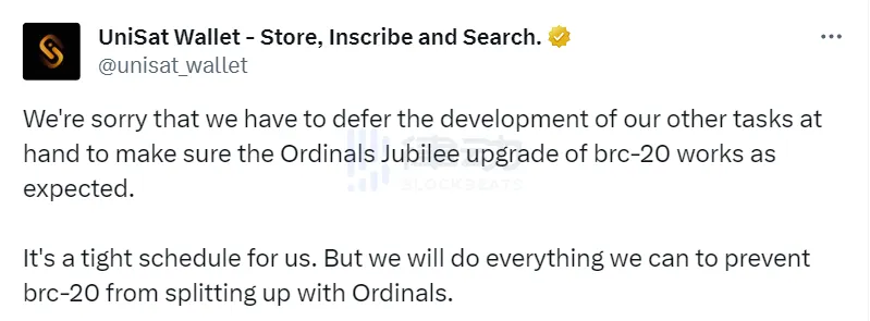 UniSat 一直以来的动作都是希望快速地推动 BRC-20 相关的发展。从 BRC-20 Swap 的功能研发,到本次直接表示要推动 BRC-20 索引所运行的 Ordinals 协议版本升级。在 domo 的推文发出后,UniSat 也发推进行了回应,表示目前将暂停其余开发任务,尽全力保证 BRC-20 升级的按期进行。同时 UniSat 也指出,他们会尽全力保证 BRC-20 不发生「分裂」。