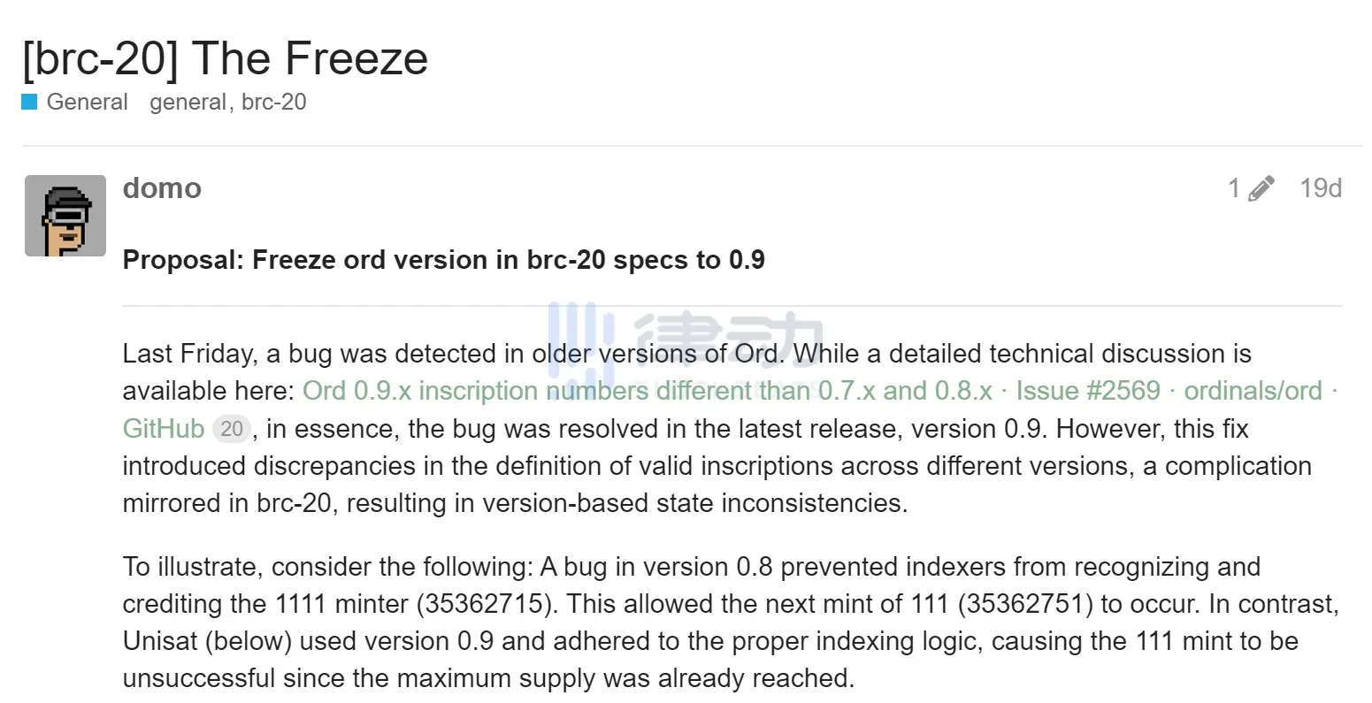 BRC-20 索引规范「冻结」提案由 BRC-20 协议创始人 domo 于 10 月 26 日提出。domo 之所以将该提案命名为「冻结」,是因为该提案的内容是 BRC-20 协议决定将 BRC-20 的索引标准化(保持)在 v 0.9.0 来维护索引的稳定。