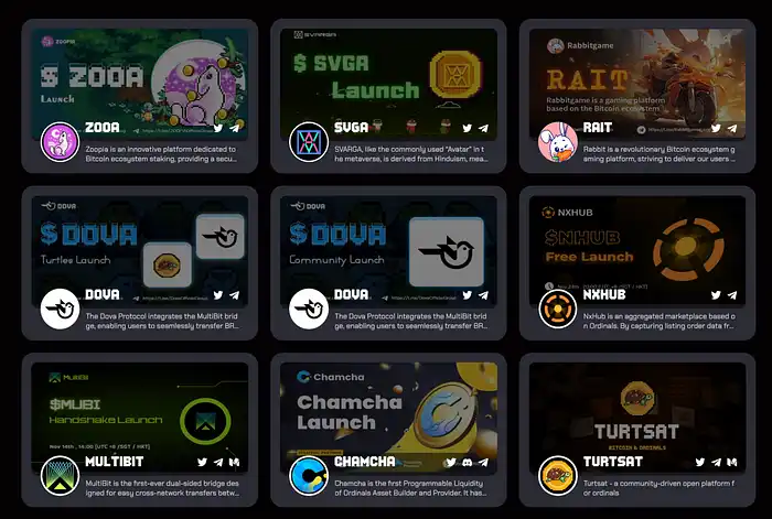 该项目愿景为打造一个全方位的比特币网络生态 Super App,包括钱包、DEX、跨链桥、质押和其他 DeFi 解决方案等。项目目前已发布的产品有类似 Coingecko 风格的 DASHBORAD 平台,主要用于用户跟踪相关 BRC20 市场代币。