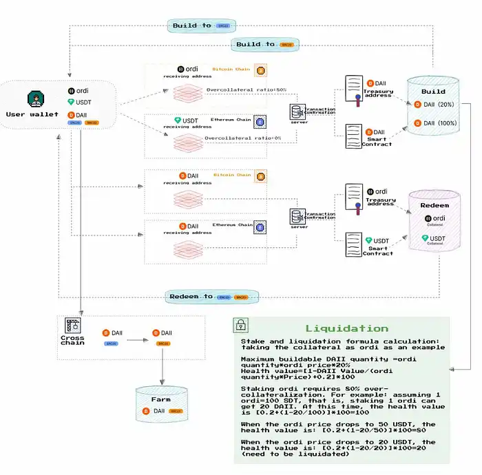 BitStable 协议支持在比特币网络、以太坊网络和 BNB 链抵押 ORDI 或 BTC/BTCB 获得稳定币 DAII,通过比特币区块链上铸造的 DAII 可以桥接到以太坊,以太坊链上获得 DAII 的用户可以使用 USDT 等稳定币进行 1:1 兑换,然后跨链到比特币网络。ORDI 的抵押率为 500%。协议文档内并详细比特币网络上清算模块实现过程。当用户需要赎回以太坊链上的抵押品时,需要在 BitStable 平台上赎回 DAII。