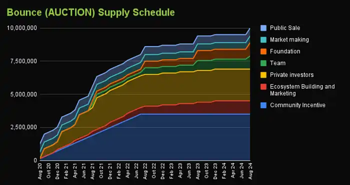 BSSB 的总量为 2100 万枚。其中 50% 在 Bounce Finance 上公开发售,团队将持有 5%(6 个月锁定后,15 个月线性解锁),空投占 3.5%,质押奖励占 36.5%,LP 占 5%(无锁定)。在 Bounce Finance 上 60% 通过 AUCTION 质押获得,40% 通过拍卖获得。