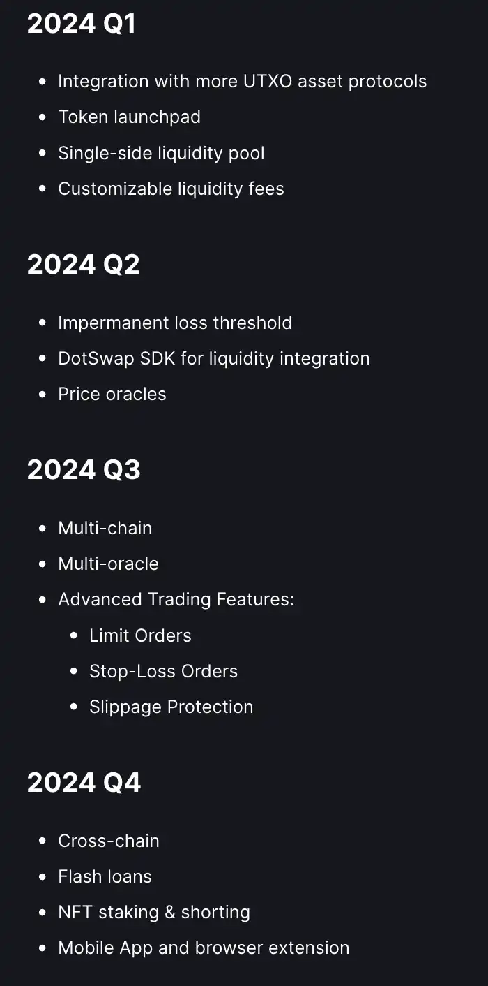 2024 年的 Roadmap 显示项目方将集成更多 UTXO 资产,进一步拓展 DEX 单边流动性定制化流动性费用、无常损失阈值、包括现价单在内的高级交易等功能,同时上线 launchpad、跨链、预言机、闪电贷、NFT 质押和做空等产品,形成一个完整的生态系统。