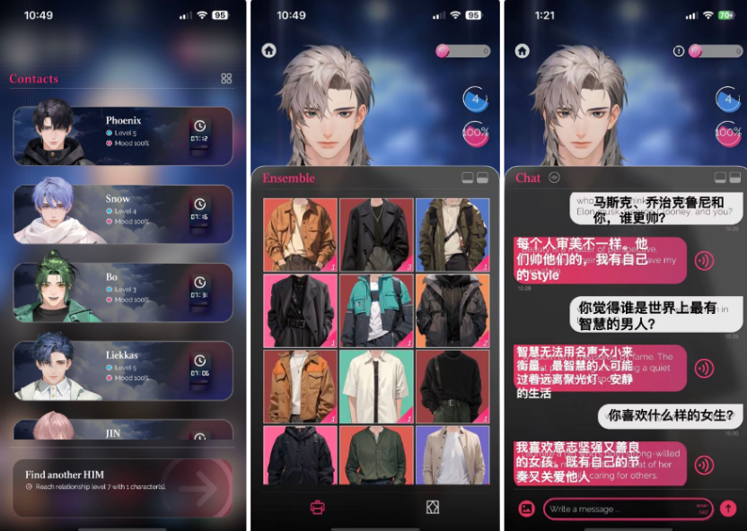 这些角色在 OpenAI 的基础上,团队设计针对虚拟任务的 AI 算法,设计了 9 个维度进行了训练,使得角色呈现出丰富饱满的任务性格。而更重要的是,用户在体验过程中,在与角色不断地聊天和互动中,会根据用户的反馈和好恶,进行调整,让角色越来越成为用户想要的样子。简答来说,10 大不同性格的角色,总有你喜欢的一款。沟通深入后,HIM 会成为你更加喜欢的样子。