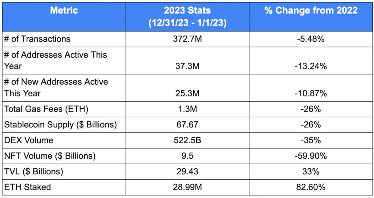 消极的一面:2023 年,所有主要指标都出现下降。值得注意的跌幅包括总 Gas 费(-26%)、NFT 交易量(-59.9%)和 DEX 交易量(-35%)。
