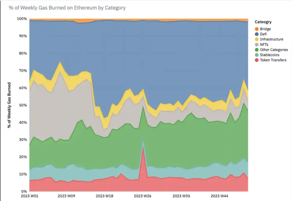 ·由 Uniswap 领衔的 DeFi 占以太坊 Gas 使用量的 41%,强调了 DeFi 和 DEX 在以太坊用例中的重要角色