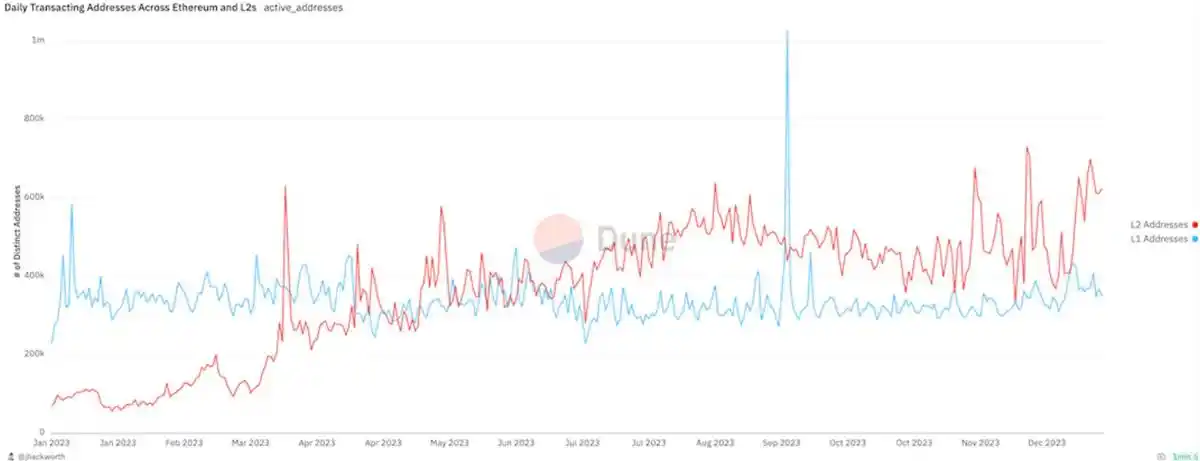 L2 采用的增加导致活动激增。L2 上的活跃地址从不到 70,000 个地址增加到超过 400,000 个地址,甚至超过了以太坊的总地址。