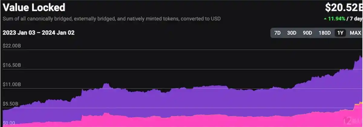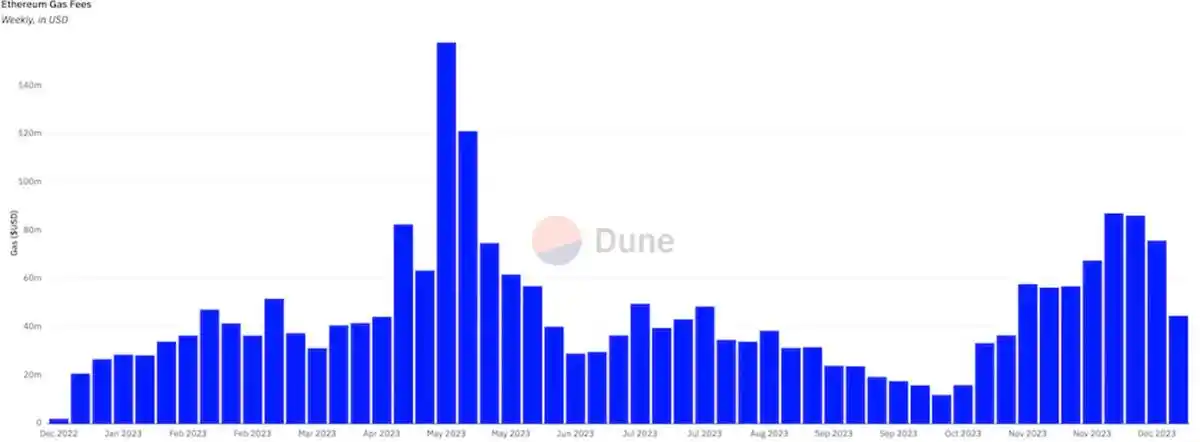 积极的一面:在 2023 年末,数据有所回升。2023 年初至今,TVL 增长了 33%,这可能归功于 ETH 和其他代币价格的上涨。此外,尽管有一些指标表现不是很出色,但情况现在正在好转,包括自10 月以来 200 亿美元的稳定币流入,以及 Gas 的强劲上升趋势。