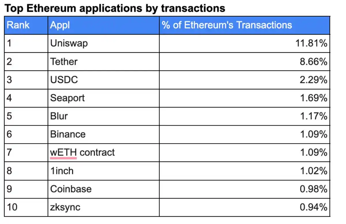 ·USDC 和 Tether 是交易量最高的两个应用,占 Gas 使用量的 7%,突显了以太坊上对稳定币的需求
