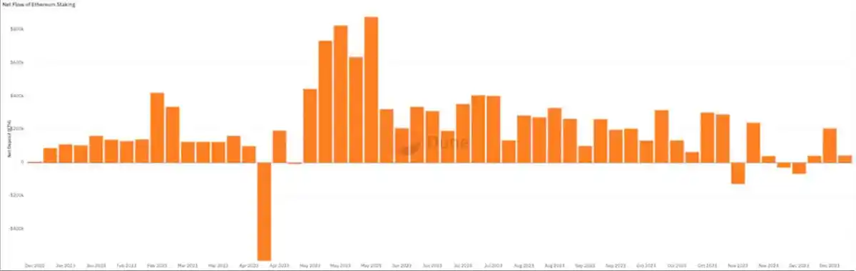 2023 年是 ETH 从信标链提现的元年,导致大量资金流入质押。2023 年,质押的 ETH 供应量增加了 82.6%,现在约有 24% 的 ETH 供应量被质押。2023 年是 ETH 质押数量增幅最大的一年。