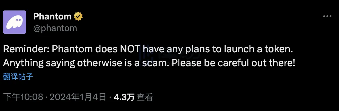 1 月 4 日,Phantom 表示,没有任何发行代币的计划。任何其他说法都是骗局。