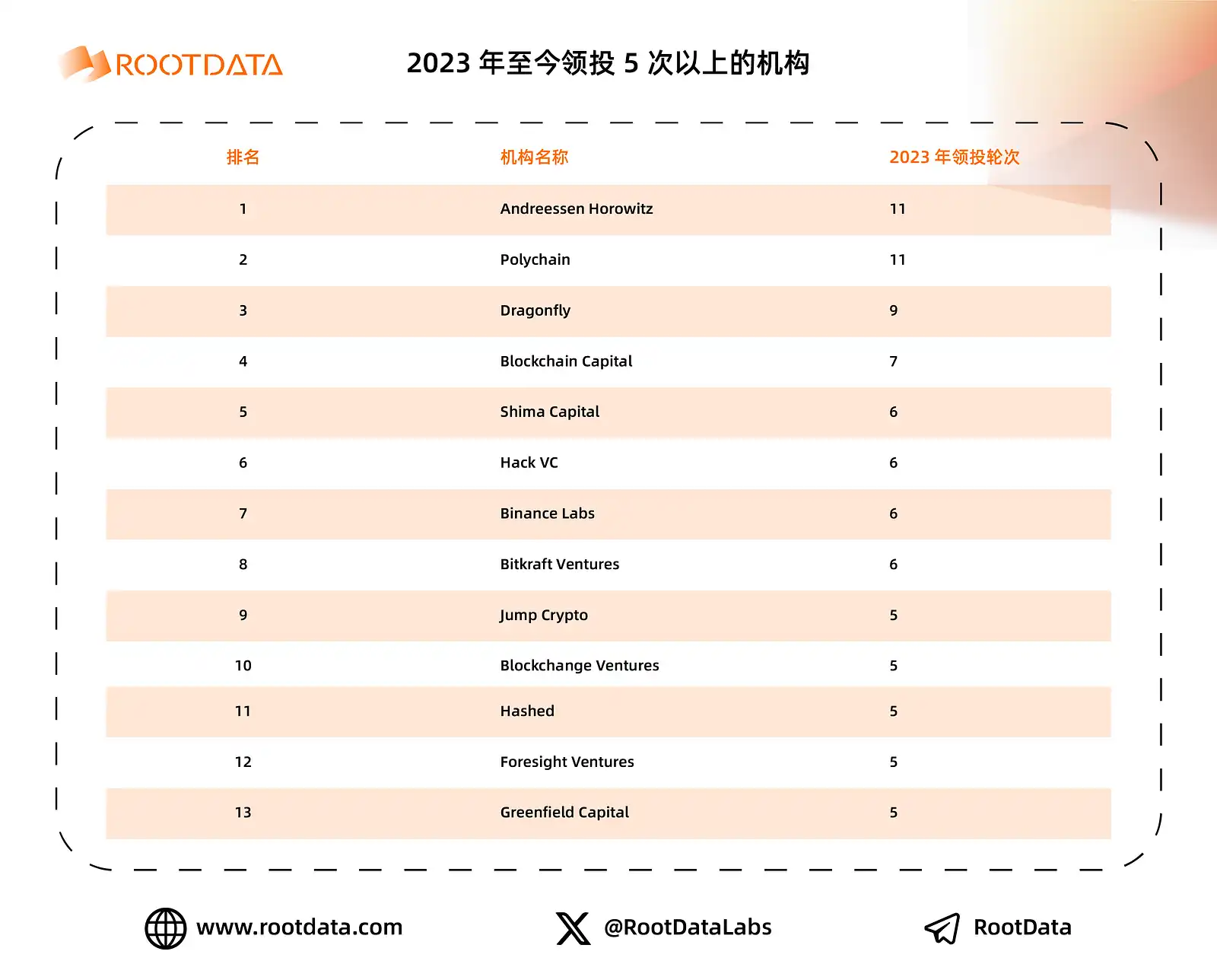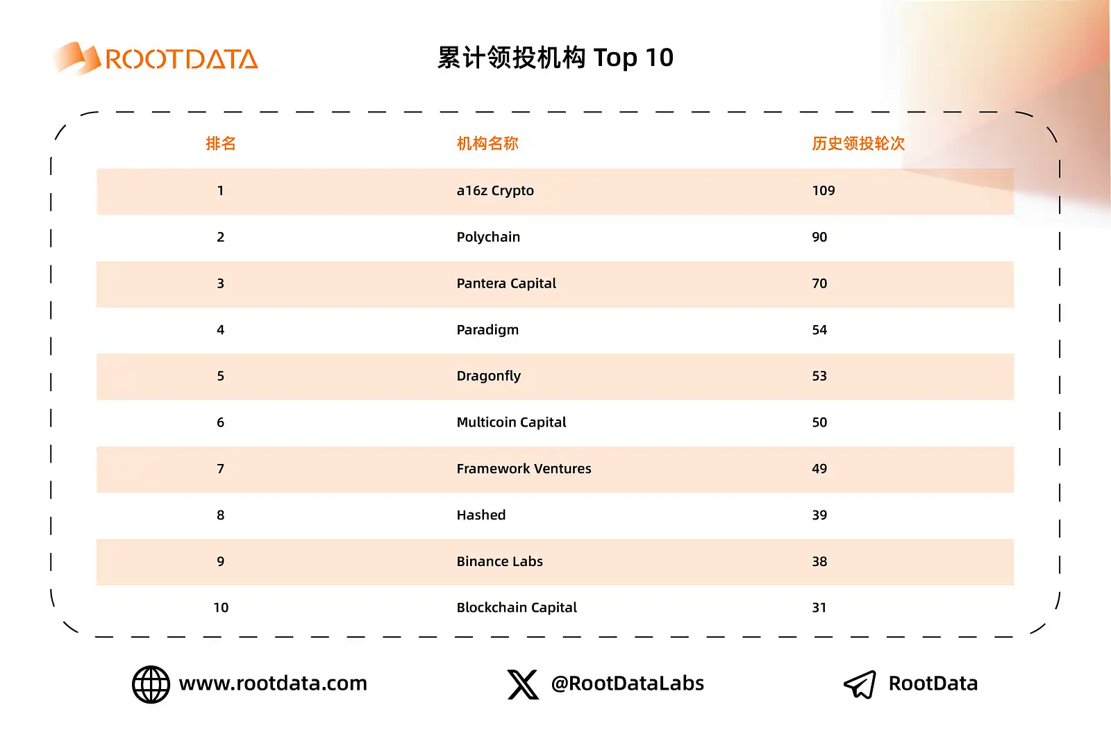 据 Rootdata 数据显示,a16z crypto 位居累计领投机构榜首,历史领投轮次为 109 轮。