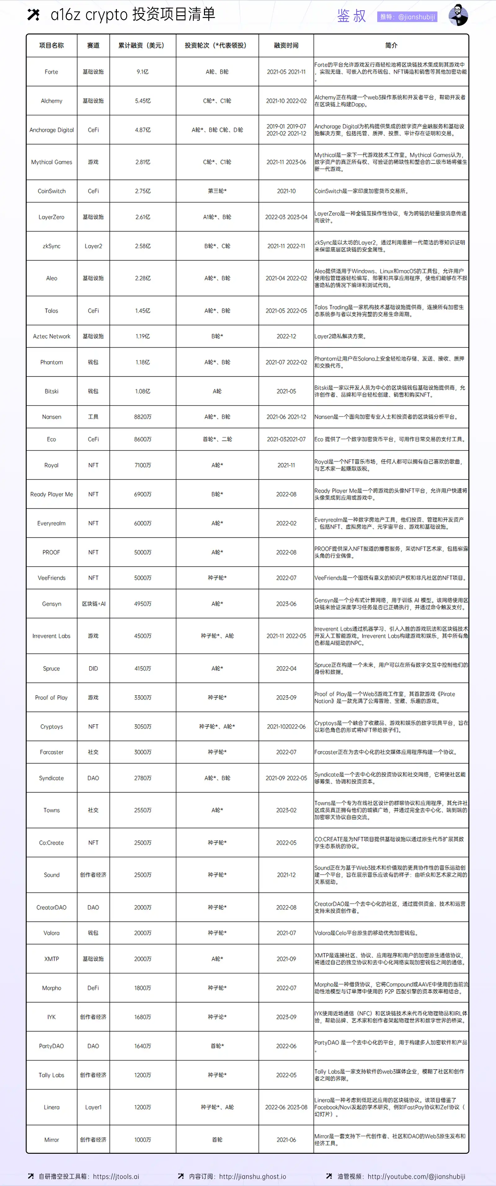 a16z crtpto 的押宝能力是有目共睹的,以下是笔者从 a16z crypto 的投资版图中筛选出来的潜力项目,其中已经剔除掉了已发币的、rug 的、融资额不足 1000 万以下及为传统行业服务的(不太可能发币)项目,供读者参考(以累计融资额度为排序标准):
